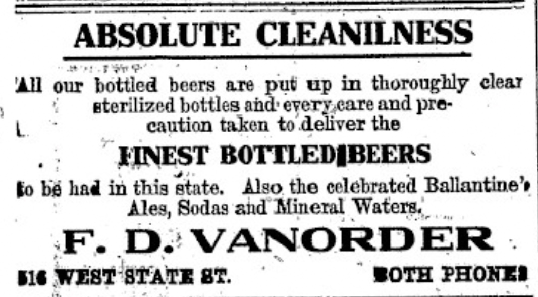 Advertisement for F. D. Van Order, "Finest Bottled Beers" Ithaca Journal November 9, 1909, p5, col 1.