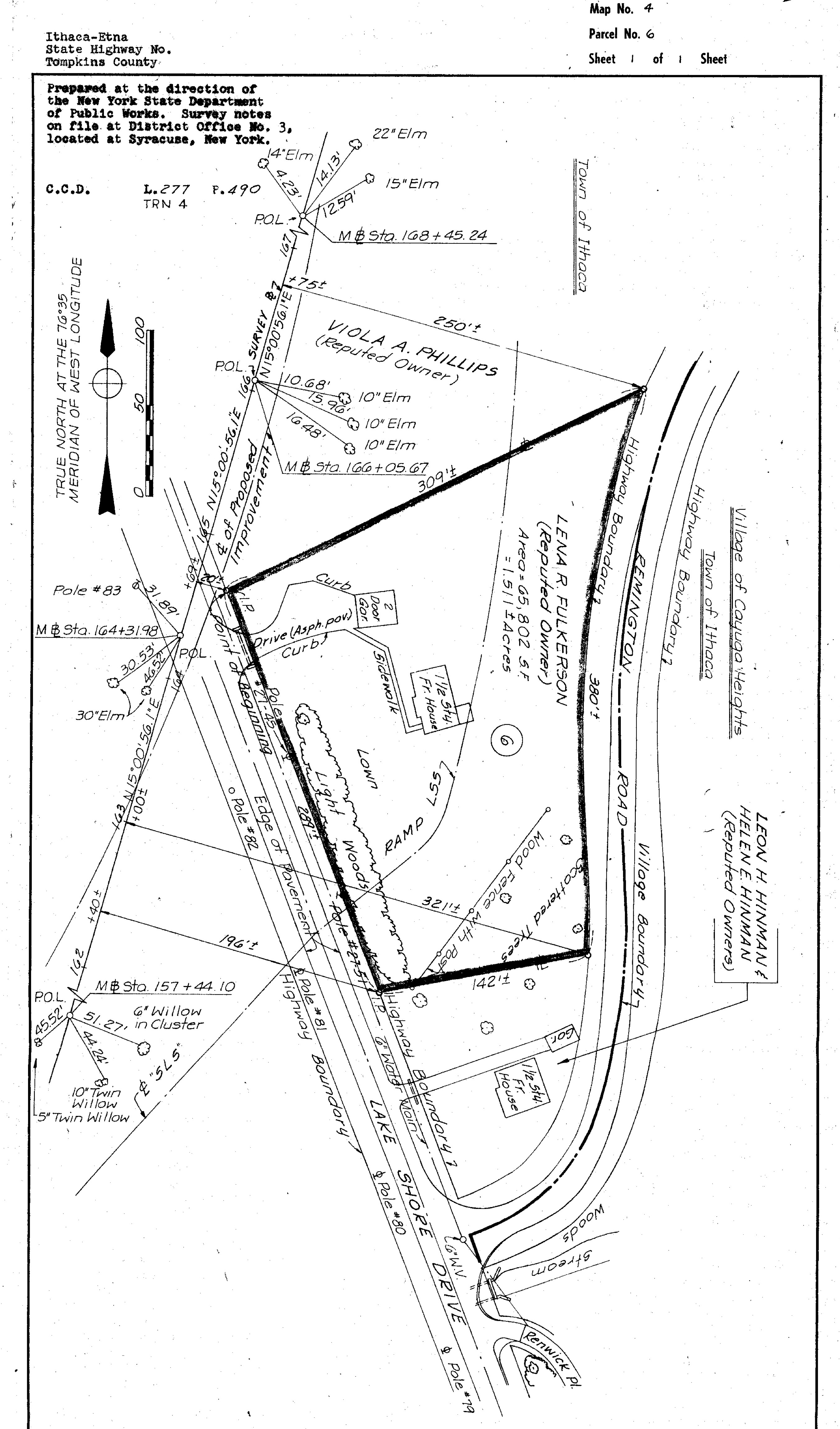 1961 Survey map of 805 East Shore Dr, presented north up, was prepared for appropriation of the property by New York State for the Ithaca-Etna State Highway Project, using a legal process sometimes called "eminent domain." This road became State Route NY 13. Note: Previous routing of NY 13 through Ithaca is described at https://en.wikipedia.org/wiki/New_York_State_Route_13#Routing_through_Ithaca ]