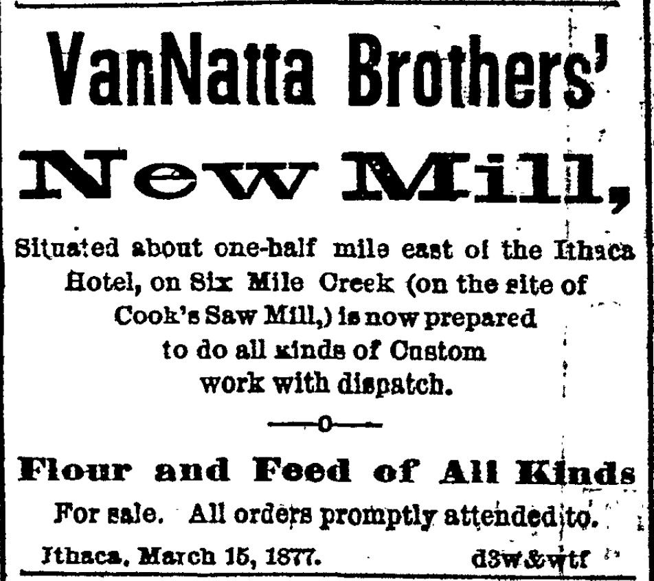 Advertisement for VanNatta Brothers' New Mill, Ithaca Daily Journal, March 16, 1877, 4.