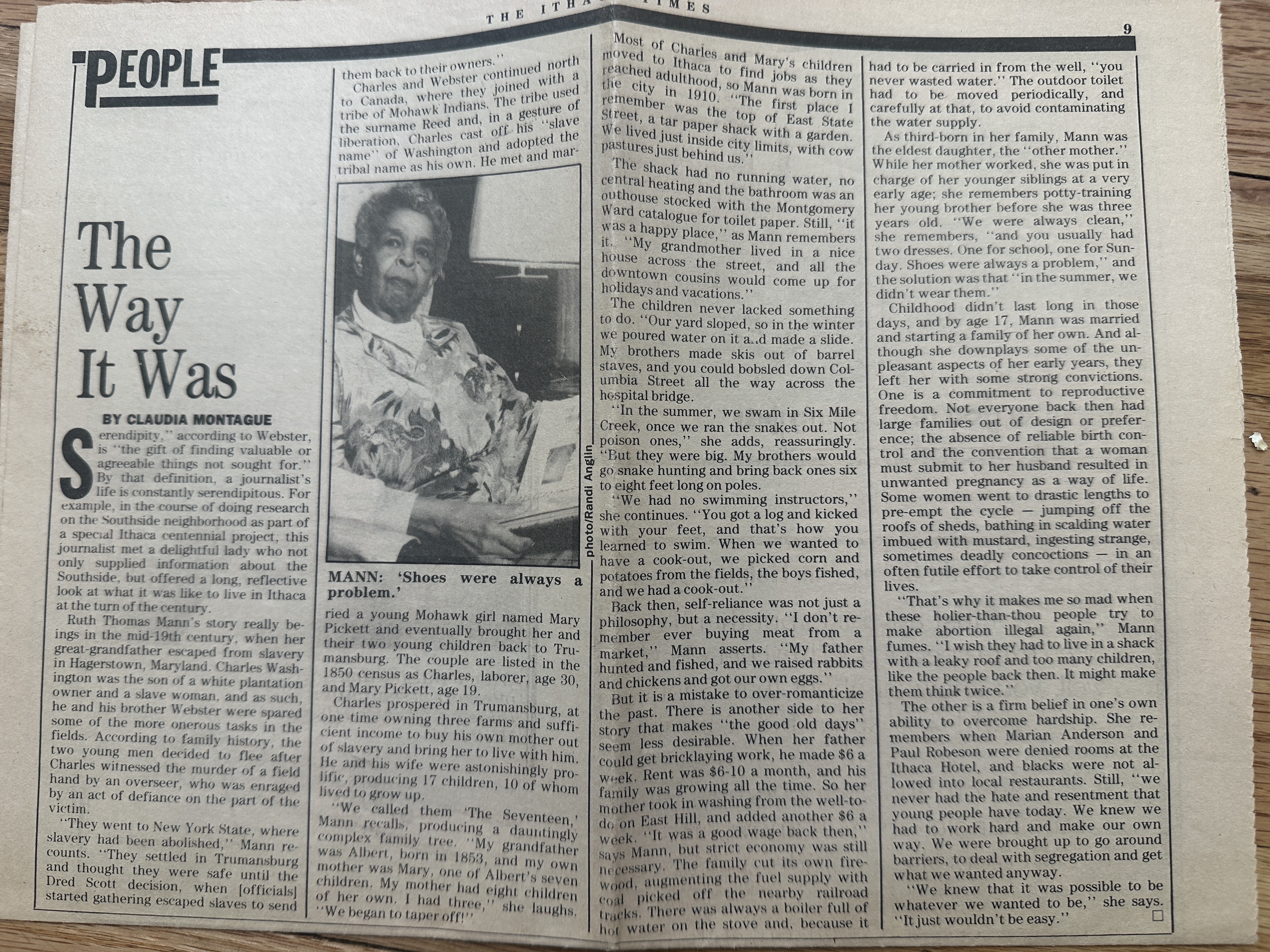 Ruth Thomas Mann profile by Claudia Montague, The Ithaca Times, Dec 24-30, 1987