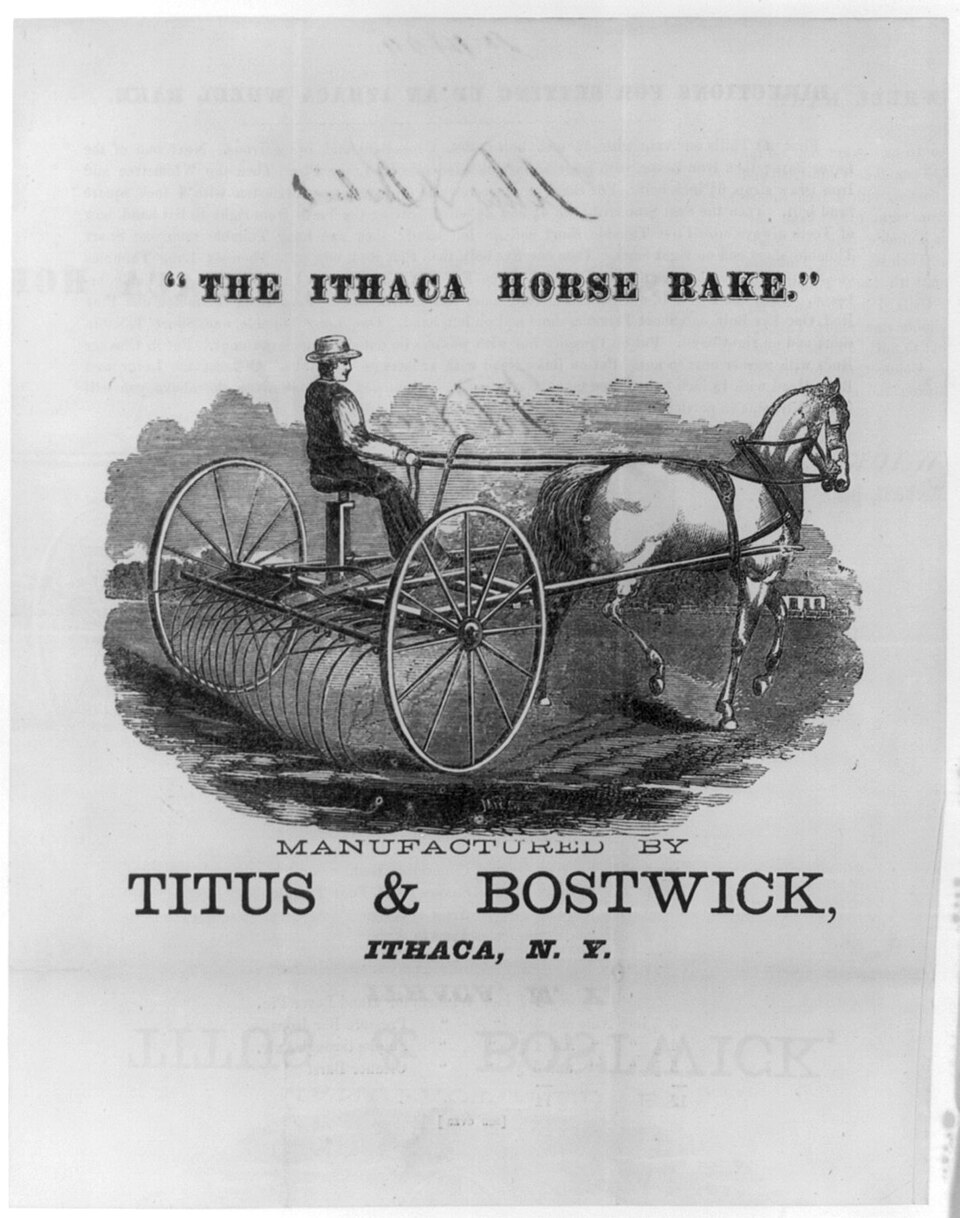 "The Ithaca horse rake." Manufactured by Titus & Bostwick, Ithaca, N.Y. Abstract/medium: 1 print : woodcut. Library of Congress, http://loc.gov/pictures/resource/cph.3a44256/